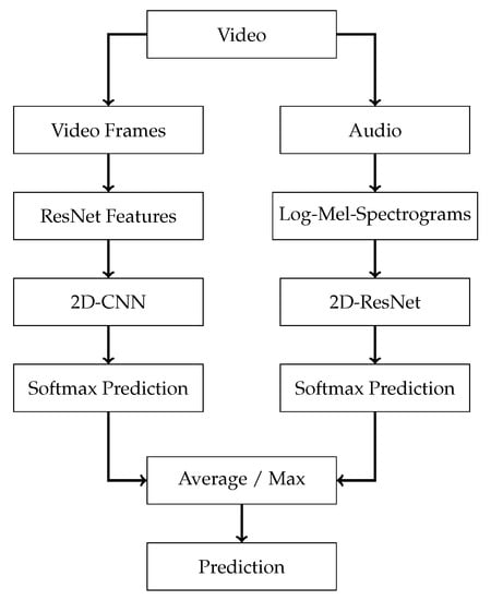 Late fusion. Visualization of how two seperate models can be fused through softmax average: a visual pathway that uses a feature extractor with a 2D-CNN, and an audio pathway that uses Log-Mel spectrograms with a 2D-ResNet. These models are trained individually, and the output predictions are fused by softmax (average or max).