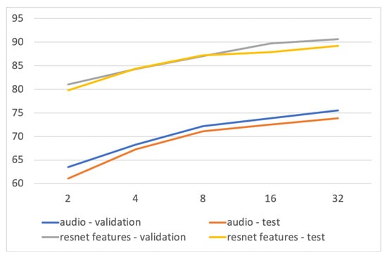 Classification performance with respect to window size (2–32), using the audio model and the ResNet visual features on the validation and test sets. In general, larger windows lead to better results.