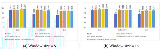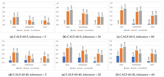 Our experimental results demonstrate the potential of using multiple modalities as the performance of detecting events increases in many of the selected configurations when features are combined. However, we have also seen that there is a difference in the benefits gained from the multimodal approach with respect to different event types. More specifically, the combination of audio and visual features proved more beneficial for the Goal events than for Card and Substitution events. This yields insights into a potential new research direction, where we could decide on the use of multiple modalities based on targeted event categories since different events have different “associated” audio (e.g., for goals, it is usually some predictable high volume cheering, whereas for substitutions and cards, we do not have the same predictable audio). In summary, an ML-based event detection component utilizing several available data modalities can be an important component of future intelligent video processing and analysis systems.