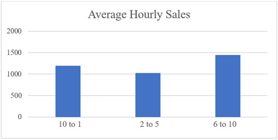 The raw data was collected in three chunks ranging from 8 September 2016–31 December 2016, 1 January 2017–31 December 2017, and 1 March 2018–5 December 2019. Restaurants gather customer information through a point of sale (POS) system, which catalogs a wide array of information, including the time, items sold, gross sales, location, customer name, and payment information such that each sale made provides a unique data point. While there is plenty of interesting information to mine from the raw data, we have narrowed down our interest to just the gross sales, date, and time. For each data dump, we extract the three previously mentioned features. The time is recorded down to the second, so every item sold within an hour is easily aggregated together. Likewise, it is a simple task to group all hours of sales from a single day from 10:00 a.m. to 10:59 p.m., as seen in Figure 1. Thus, by this stage, we have processed each day of gross sales into an instance of 12 h and date. We may then consider how partitions of hours will aid in the completion of the forecasting task. To simplify the forecasting problem, we bin the daily sales into three partitions from 10:00 a.m. to 1:59 p.m., 2:00 p.m. to 5:59 p.m., and 6:00 p.m.to 10:59 p.m., as shown in Figure 2. Instead of predicting an entire day, we will train a model to predict just one partition. The focus of this work is forecasting the middle partition from 2:00 p.m. to 5:59 p.m., although the same methods can be used on the remaining partitions.