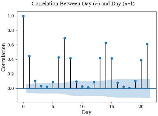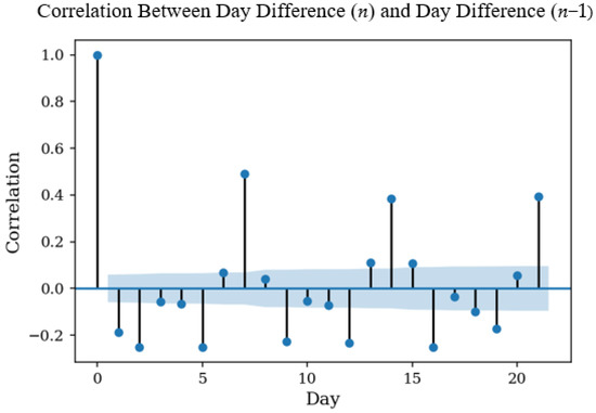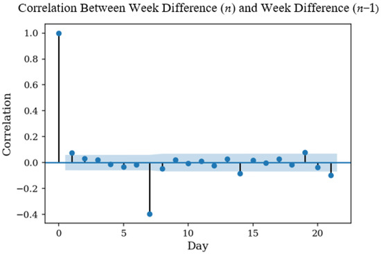 From Figure 6, we again view that the trend has been differenced out of our dataset. Let us also verify with Figure 7 that the weekly correlation has been removed. When reviewing the figure, we see that all but seven days in the past have had correlation removed to the point that they can be considered ‘not correlated.’ Presumably, there will be no assumptions made by our models about seasonality, which makes for a prediction not dominated by average results.