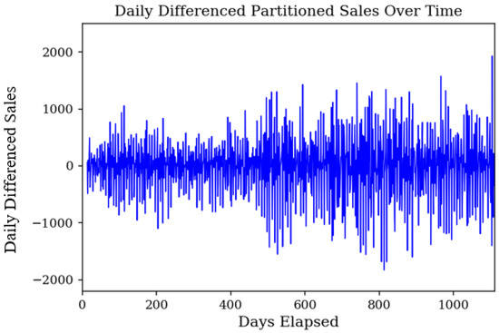 To remove trend and seasonality to create a stationary dataset, we employ a technique called differencing [23]. We will no longer be predicting the actual sales amount but the difference in sales from the previous time-period. Differencing is allowed for any time window, although most often, we difference D (t) with previous day D (t − 1). We study two differencing windows in detail: daily difference D (t − 1) and weekly difference D (t − 7). If necessary, it is possible to increase the order of the difference by differencing the data as many times as desired. We obtain a daily difference (Equation (1)) instead of the actual sales between 2 p.m. and 5 p.m., and we take the difference of sales such that,