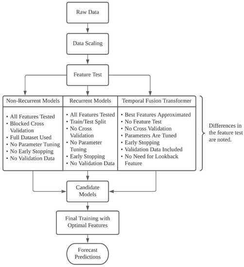 We outline the full learning process now that the relevant pieces have been defined. The full outline can be followed in Figure 8. First, the raw dataset is collected. Preprocessing steps are completed to generate all features and to create the different datasets. For the three datasets, we complete feature tests, optimizing the MAE score, with all models to evaluate the best number of features for training. The top eight non-recurrent models and all recurrent models are considered candidate models for each dataset. A train/test split is used for the final training where the candidate models are trained using all available data not used in the baseline test. Models are trained by optimizing the MAE score in the final training. We then use our models to forecast the testing datasets to make final comparisons using our pre-defined metrics.