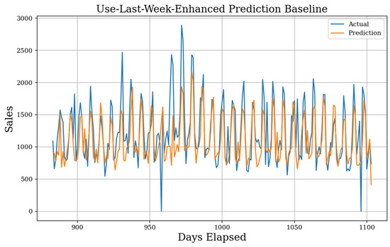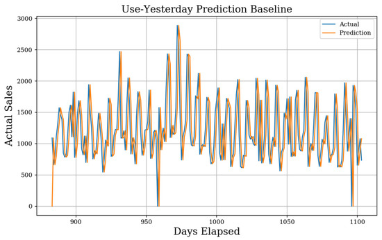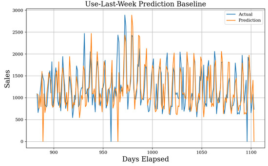 In Figure 9, we see the actual value in blue with our prediction line in orange. The mean absolute error (MAE) score for the Use-Yesterday prediction is 403. Our data is correlated weekly instead of daily, which yields a high error. This does show the upper bounds prediction error, so it is a simple goal to achieve better results. In Figure 10, we see the result of the Use-Last-Week prediction on the test dataset. The MAE score for Use-Last-Week prediction is 278. As expected, we see a large increase over the previous baseline due to the weekly seasonality, and we consider this to be a well-reasoned prediction. There are issues regarding zero-sale days as they propagate errors forward.