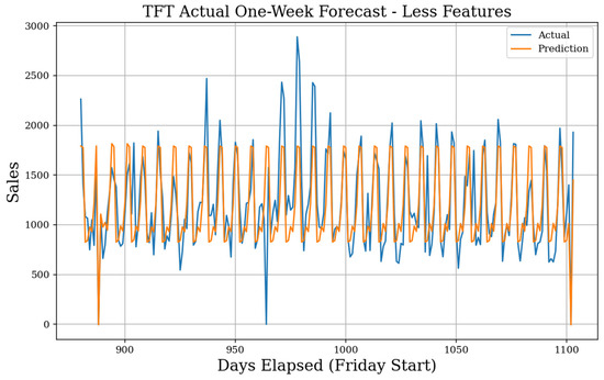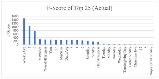Figure 12 shows the rankings of the top 25 features in the actual dataset and their associated F-Scores. This ranking step is completed for each of the actual, daily differenced, and weekly differenced datasets, and the results can be seen in the Supplementary Materials Figures S10–S12. Since the Temporal Fusion Transformer (TFT) model injects static context and does not need the 14 days of previous sales, we also give the top feature rankings with the 14 days removed in Supplementary Materials Figures S13–S16. Examining the results of the actual dataset, we see by far the most highly correlated features are the weekly average sales, the sales from one week ago, and the sales from two weeks ago. One feature of note, the year scores high, even though predicting sales by the year is not a good metric in reality. Since the actual dataset has a built-in trend, the feature seems more contextual than it really is. The daily differenced dataset, which has successfully removed trend, shows the highest scoring features as Monday and Saturday, as well as sales from one and two weeks ago as before. Although scores are not at high as before, there is still a good correlation, and features relying on trends do not rank highly such as before. Finally, the weekly differenced rankings show further diminished F-Scores. Sales from the day one week prior remain a consistent, highly correlated feature. Since the most correlation between instances has been removed by weekly differencing, holidays are ranked more highly than most other features.