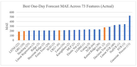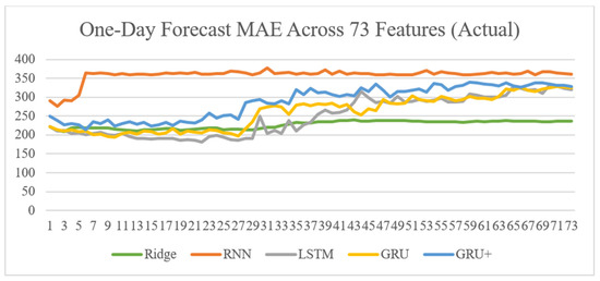 The test to find the optimal number of features is completed for each model on each of the actual, daily differenced, and weekly differenced datasets for one-day and one-week forecast horizons. First, we examine the one-day results, followed by the extension to one-week. Figures for one-day results beyond the actual dataset can be seen in Supplementary Materials Figures S16–S21. The one-day actual feature test, shown in Figure 13, shows very promising results for the RNN models with LSTM using 22 features and GRU using 10, both scoring higher than other models. Other than some ensemble and linear non-RNN methods, most models received the highest MAE score from a smaller number of features on the actual dataset due to the high correlation of just a few features. This behavior is seen clearly in Figure 14 where all RNN models perform much worse after selecting more than 20 features. The one-day daily differenced feature test shows worse MAE scores overall, and the RNN models perform severely worse. Due to daily differencing linearly separating each instance, the best performing models may make use of more features. Kernel Ridge regression with 72 features received the best MAE in this stage and is comparable to the best results in the actual dataset. Ridge regression steadily decreased in MAE as the features increased, but RNN models fluctuated with an upward trend instead of improving, giving the best results with fewer features. The final weekly differenced one-day feature test gives steadily worse results for all models, and the RNN models are outperformed again by most other ML methods. For most models, except for some tree-based methods, the MAE never decreases beyond adding a small sampling of features, around 14 features for many models. For one-day feature testing, we acquire the best results overall from the actual data using few features and daily differenced data using many features, with the weekly differenced results underperforming overall with a middling number of features.
