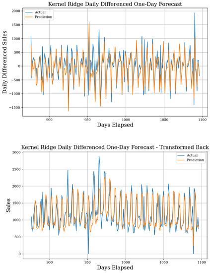The best model for forecasting one-day into the future implements the kernel ridge algorithm with a test MAE of 214, sMAPE of 19.6%, and a gMAE of 126, although all 25 top models are shown in Table 3. The dataset used was the daily differenced dataset, and the forecast result is seen in Figure 15. This is the best individual MAE score among all models. The TFT model with fewer features forecasted over the actual dataset also did well with an MAE of 220, sMAPE of 19.6%, and a gMAE of 133. This model better captures special day behaviors but is less adaptive since it uses fewer features. The ensemble Stacking method also received good results using the actual dataset, making it comparable to the TFT model. Otherwise, many models outperformed the best Use-Last-Week-Enhanced baseline. When examining datasets, daily differencing consistently achieves scores higher than the actual or weekly differenced dataset, especially with linear models. RNN models require the actual dataset to achieve results which are better than the baseline and still perform worse in some cases. The actual dataset still achieves below baseline results with other ML models as well; they are just not as good as seen when differencing daily. Finally, the weekly differenced dataset provides results almost entirely worse than the baseline, with the best result coming from the Voting ensemble. The full table of test results with all models is given in the Supplementary Materials Table S9, and we give some figure examples from high performing or interesting forecasts in Supplementary Materials Figures S28–S35.