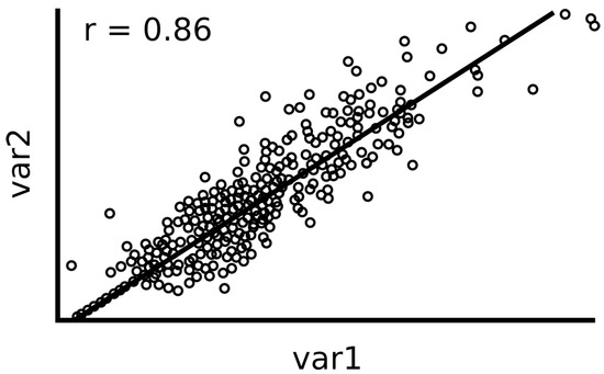 The Pearson correlation [,] coefficient has been widely used to understand relationships between pairs of variables. Given its ease to calculate and interpret, the Pearson correlation is widely used by statisticians to calculate linear correlation between features. The simplicity of the Pearson correlation r can be observed in (Equation (1)).