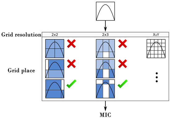 The MIC [,] is a measure of correlation among two variables. Its general idea is to establish whether two variables (features) are related linearly or not linearly. For this, a grid is generated and drawn over their dispersion graph to compute the degree of relationship between them by square grid. Since the number of possible grids can be large, it is necessary to find the best number of grid partitions (grid resolution) and their best location (partition placements). Thus, to compute MIC efficiently, all the grids are explored using the following constraint , where n is the total amount of points representing the data of the tuple. This restriction has been shown to work well in practice for several problems []. Similarly, for each resolution explored, the partition positions that produce the higher mutual information must be found (Figure 2). Then, the indicator of mutual information is computed by using the following equation (Equation (4)).