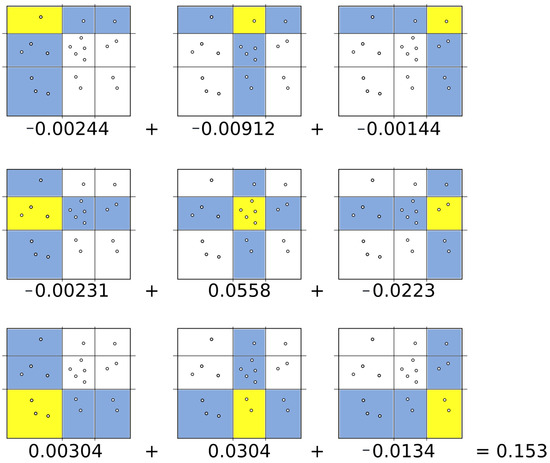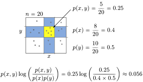 where X and Y represent random variables, is the joint probability for the regions x and y, respectively, while and are their marginal probability distributions []. (Figure 3) shows a possible partition. The regions marked in blue correspond to the column and row , respectively. The quadrant for the intersection of column x and row y is highlighted in yellow with data points. With this information, it is easy to compute the following probabilities , and . Substituting these probabilities in (Equation (4)), the mutual information of the grid can be calculated. The following figure (Figure 4) shows the complete procedure to compute the mutual information for this example.