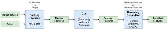 The first step is feature scoring; this step compares every feature with the target to determine which features are relevant. If a feature has a high score it is considered relevant, otherwise it is considered irrelevant. Even MIC Score is limited to the value between the range [0, 1] and it is not trivial to determine a threshold to define if a feature is relevant or not.