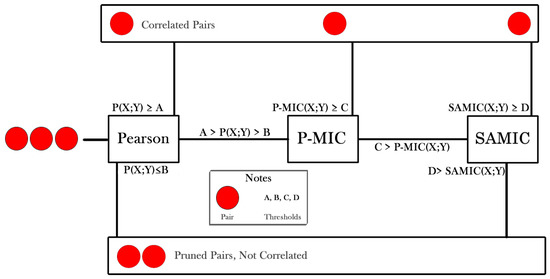 The process is described in Algorithm 4. This is a heuristic process based on the correlation of the comparative between Pearson score vs MIC score []. The cascade of Algorithm 2 is mainly a sequential filter that tries to avoid using computationally expensive algorithms, pruning pairs of features on each step. Figure 6 illustrates the process.