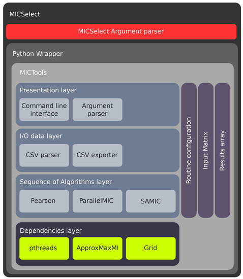 The MICTools layer performs the MIC algorithms estimation sequence explained in Section 3.1. It contains several sub-layers that perform simple tasks, these layers are: presentation layer, I/O layer, sequence of algorithm layer and dependencies layer.