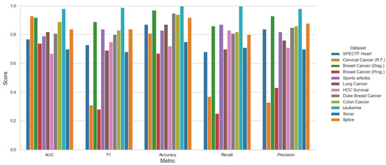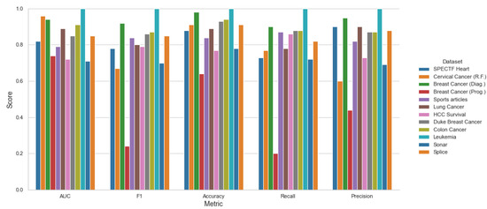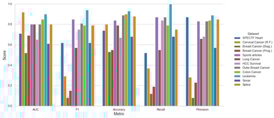 The software–hardware configurations to run the experiments were the following: Ryzen 5800×, 4 × 16 GB Kingston DDR4, Samsung 1TB 970 Evo Pro, Ubuntu Desktop 18.04 × x86-64. It is clear that the proposed framework can obtain better results over the testing algorithms. However, we can see that on the Lung Caner and Sonar datasets, for example, the other algorithms obtain a better AUC, but the time complexities are higher.