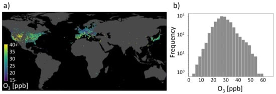 Air pollution poses a significant environmental risk to human health, leading to 4.2 million premature deaths every year []. Therefore, air quality monitoring networks are established in many countries to warn the public, monitor compliance to regulations concerning air pollutant emissions, and analyze observations to assist with the development of new regulations [,]. Tropospheric ozone is a toxic air pollutant. In contrast to stratospheric ozone, which protects humans and plants from harmful ultraviolet radiation, tropospheric, near-surface ozone harms humans and plants. It is also a greenhouse gas []. Uncovering the spatial variability of air pollutants such as ozone is crucial for controlling air pollution and assessing human exposure.