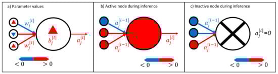 Visualization method for neural networks. It is possible to visualize the trained neural network weights and biases , as shown in (a). During inference, active neurons (activation ) transport a signal, as shown in (b), whereas it is also possible to have inactive neurons that do not transport any signal; see (c). Note that we use lowercase letters to indicate the components of the vectors and matrices.