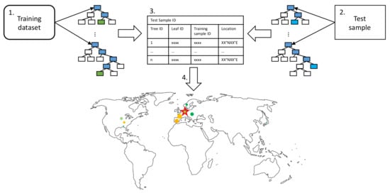 Since we can represent our data in the geographical space, we use a more intuitive way of visualizing the basis set of influential training samples that the random forest used for its prediction. By visualizing the location of the basis set used for prediction on a global map, we display the random forests’ functioning. We name this type of visualization leaf activation to emphasize the similarity to an activated neural network during prediction. The steps to create this kind of visualization are illustrated in Figure 3 and listed in the following: