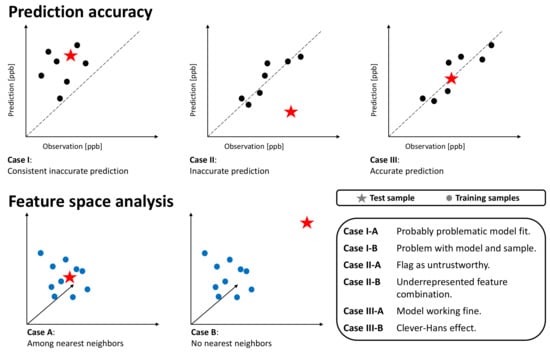 - Case-III-B: A sample of k-nearest neighbors leads to scattered predictions; both accurate and inaccurate predictions are possible. The test sample is accurately predicted but due to the wrong reasons. The accurately predicted test sample has no nearest neighbors in the feature space. The models are predicting a correct value but due to the wrong reason. We can flag this case as the Clever-Hans effect [].