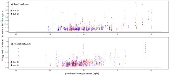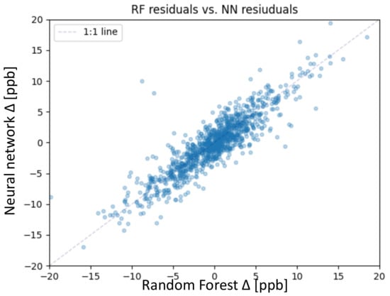 The focus of this study lies on the test set; therefore, we take a closer look at the residuals of both models. The residual is defined in Section 5.2, Equation (9). Figure 6 shows the residuals of the random forest together with the residuals of the neural network. Both models mainly predict the average ozone on the test set with a residual error below 5 ppb. We consider predictions with residuals below 5 ppb as accurate, considering the conservative measurement error estimation of 5 ppb []. From 1110 test samples, the random forest accurately predicted 867 samples, and the neural network accurately predicted 842 samples. The correlation between the residuals of the random forest and the neural network is shown in Figure 6. The correlation is high, so apparently, some test samples are difficult to predict for both models. The following Sections focus on these 268 (neural network) and 243 (random forest) inaccurately predicted samples.