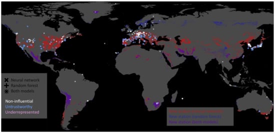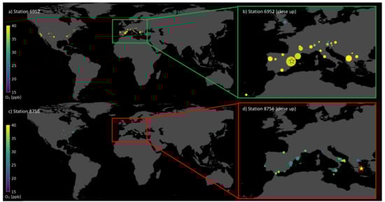 In this section, we take a closer look at the visualization of single prediction patterns by both machine learning models. As described in Section 4.3, it is possible to show in geographical space upon which samples the random forest bases its prediction. Table 2 gives the coordinates, and the stations are displayed in Figure 7. Both test samples are located in the Mediterranean area, in Spain (a,b) and Greece (c,d). Figure 3a,b show the accurate prediction, where the random forest bases its prediction on stations with similar features and similar average ozone values. The most influential training samples are located next to the target test station in the geographical space. The predicted value is 41.99 ppb compared to the observed value of 42.44 ppb. In contrast, Figure 7c,d shows an inaccurate prediction with a residual of 12.72 ppb, while the target average ozone was 40.17 ppb, which is indicated by the bright yellow star in Figure 7d. In this case, the influential training samples have much lower average ozone values. Moreover, there are hardly any influential stations with larger contribution but many with small markers, even in South Korea and Japan. The accurate prediction for station 6952 is based upon 63 training stations, while the inaccurate prediction of station 8756 is based upon 122 training stations.