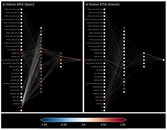 In Section 4.2, we introduced a way of visualizing shallow neural networks. We visualize the neural network while it infers the average ozone values for the same two example test stations presented in Table 2. Figure 8a shows the activation pattern caused by the accurate prediction for the station in Spain, while b shows the activation pattern for the inaccurately predicted station in Greece. The residual error for the accurate prediction is comparable to that of the random forest, 0.43ppb, while the inaccurate prediction misses the target value by 10.56 ppb. As a reference, we also show the weights and biases of the network in Appendix C, Figure A1. Left of the input nodes, we noted down the feature names, also found in Appendix A, Table A1. Red nodes indicate active input features important for the respective prediction. In both cases (a) and (b), most input nodes are light blue, indicating slightly negative values. While in (a), there are many connections activating and deactivating nodes in the first hidden layer, the inaccurate prediction (b) has a first hidden layer with mainly slightly activated nodes. The signals to the second hidden layer are visible in (a), while again, in (b), there is hardly any departure from the mean state. In the second hidden layer, the first node from the top can reduce the value of the output node, while the other four nodes increase the output (see also Appendix C, Figure A1). In (a), this node is correctly deactivated, leading to a high and accurate prediction. In (b), this node is activated such that the second hidden layer increases and decreases the output value, leading to a prediction near the average.