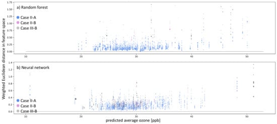 - Case-II-B: A sample of k-nearest neighbors leads to accurate prediction, while the test sample is inaccurately predicted. The k-nearest neighbors and the test station are not located next to each other in the feature space. Thus, the inaccurate prediction of the test sample is not unexpected. This points to an underrepresented test sample.