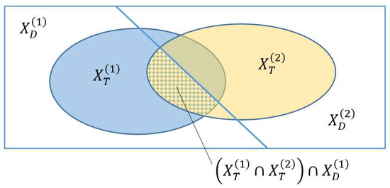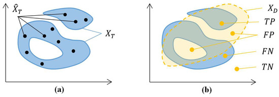 In reality, the set of points in the training dataset is discrete. In order to be able to calculate the proposed quality indicators for real classifiers, it is necessary to introduce a grid approximation of a continuous space with the restriction of a certain work area in which we will calculate the quality indicators. By limiting the space to a workspace that obviously includes sets of training and test data, we can normalize the coordinates in the range from 0 to 1. Let us introduce a uniform grid with step h over all coordinates of the limited grid space. Thus, for an -dimensional feature space, we will have grid space cells. Let us call the set of these cells the scan set . We will attribute the points of the sets and to the cells of the scan set to which they belong. Thus, the cells of the training data form the set , and the set will be formed from cells with a positive classification result for the point in the center of the cell.