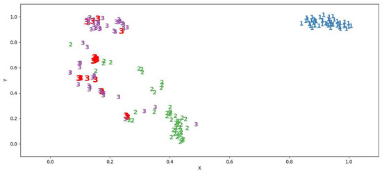 Let an adversarial attack on class be an example that is different from the examples belonging to class , but classified as belonging to it. Then, to assess the vulnerability of the classifier to adversarial attacks on class , the most valuable characteristic is , however, in cases of overlapping areas, it is also necessary to analyze .