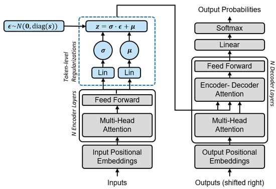 We adapted the computation of the regularization loss to incorporate a scaling factor s for the standard deviation as the hyperparameter. The closed-form of the VAE loss function (refer to Odaibo [23] for the derivation of the closed form) with a prior standard deviation and prior for a specific token’s layer outputs and becomes
