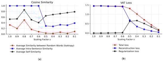 Optimizing the scaling factor s with respect to isotropy and loss values. (a) Cosine similarities of the latent representations of the VAT at the end of the training process denoting the isotropy of the latent space and the contextuality of token representations; (b) reconstruction loss, weighted regularization loss, and total loss of the VAT at the end of the training process.
