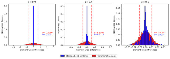 For further investigations on the distribution of the variational samples and their distance from the mean representations, the distances between latent vectors in terms of their accumulated elementwise differences (i.e., over all dimensions and vectors in the representation of the sentence) were assessed. Figure 4 illustrates the histogram of these elementwise distances for the mean vectors of the start and end sentence from the second example in Table 3 in blue. For comparison, ten random sentences were drawn from the original start sentence (with the same approach as in Table 1). The red histogram shows the distribution of their elementwise differences. In order to illustrate the effect of the regularization term, experiments with different scaling values s are shown to determine the “signal-to-noise ratio”, where the differences between mean representations of start and end sentence are considered as the signal and those between the variational samples as noise. For , this ratio is on average. A closer, dimensionwise look at all vectors (not included in Figure 4) revealed that the peak value is 2 and is achieved in only one outlier dimension: even this “feature” is thus considerably affected by the variational random noise. The histograms for and are in line with the findings in Figure 3a,b, where the representations either collapse into an identical representation for the sentences () or the real distribution approximates the variational distribution more closely ().