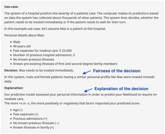 The decision-making of medical treatment belongs to high-stake decisions and needs physicians to comprehensively evaluate the relevant data concerning the current status of the patient for the corresponding treatment, either alone or together with the patient [60]. Physicians also need to inform the patient about the relevant factors which influence the treatment decision. AI can improve this process by providing a predicted decision to the physician and the patient, which could potentially reduce the extensive human errors in medical practices [61]. In this study, this AI-informed decision-making process is simulated by showing predicted medical treatment decisions with different simulated patients based on factors of gender, age, past medical expenses and pre-existing illnesses of first and second-degree family members. Although past medical expenses do not seem like a relevant factor, Obermeyer et al. [62] showed that this was used as a proxy for the seriousness of a medical condition. The decisions from the simulated AI include two options: immediate treatment or waiting for the next free appointment. These help to prioritize and order the patients according to their urgency, similar to the algorithm proposed by Pourhomayoun and Shakibi [63].