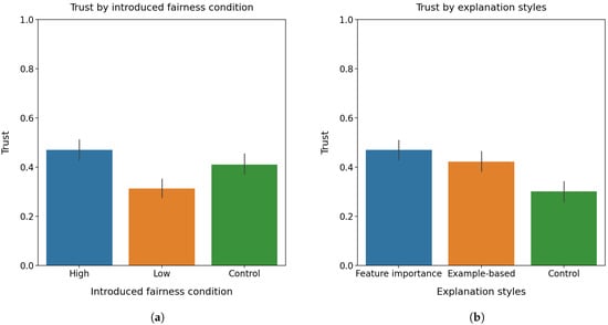User trust over fairness and explanations. (a) User trust under introduced fairness conditions. (b) User trust under explanation types.