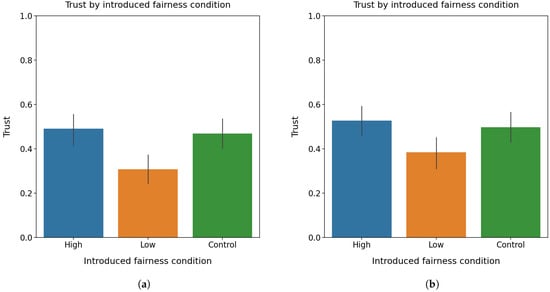 These findings imply that the introduced fairness condition did affect user trust in AI-information decision-making only under the low fairness condition, where introduced fairness decreased user trust in AI-informed decision-making.
