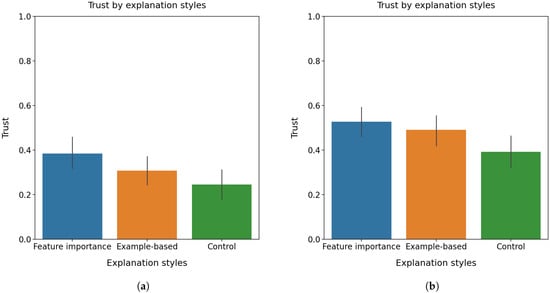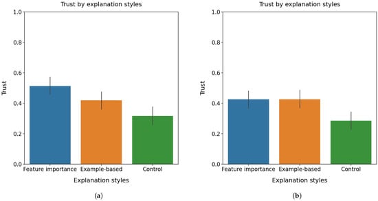 Figure 3b shows normalised trust values over various explanation conditions. A one-way ANOVA test revealed statistically significant differences in user trust under different explanation types . Then, post-hoc tests with the aforementioned Bonferroni correction were conducted. It was found that participants had a statistically significant lower level of trust under the control condition (no explanation presented) than that under the feature importance-based explanation ( 0.000) and example-based explanation (), respectively. There was not a significant difference in user trust between feature importance-based explanation and example-based explanation ().
