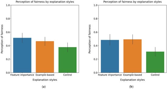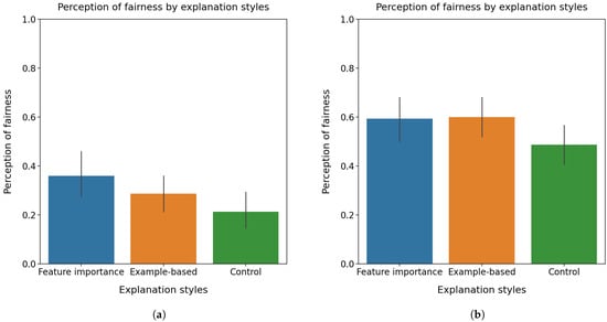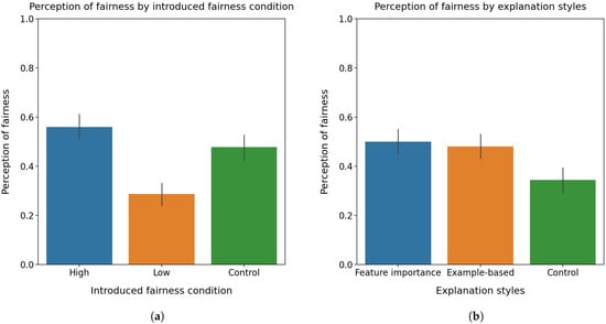 From the perceived fairness’ perspective, this study found that the fairness statement in the scenario did affect the user’s perception of fairness, where the low level of introduced fairness decreased the user’s perception of fairness, while the high level of introduced fairness increased the user’s perception of fairness. Moreover, the addition of explanations benefited the perception of fairness, and different explanation types did not show differences in affecting the perception of fairness. We also drilled down into the effects on perceived fairness under specific conditions. From the explanation’s perspective, it was found that, under example-based explanations, the low level of introduced fairness decreased the perception of fairness, while the high level of introduced fairness did not. Similar conclusions were obtained for the perception of fairness under feature importance-based explanations. From the introduced fairness’ perspective, the results showed that, under the low level of introduced fairness, feature importance-based explanations significantly increased participants’ perception of fairness, while example-based explanations did not. However, different explanation types did not benefit a human’s perception of fairness under the high level of introduced fairness. It shows that the effects of fairness levels and explanation types are different from their effects on user trust.