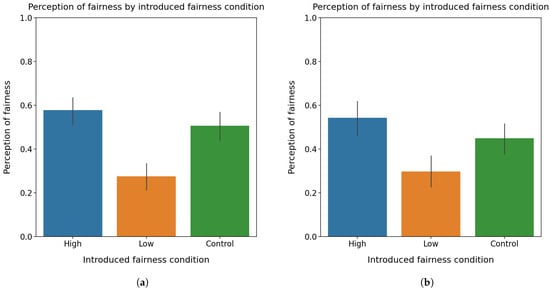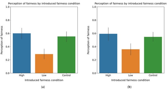 Figure 12a shows the normalised perception of fairness under introduced fairness conditions in the scenario of health insurance decision-making. A one-way ANOVA test revealed a statistically significant difference in perception of fairness among introduced fairness conditions, . The further post-hoc t-tests found that the perception of fairness was significantly higher under the high level of introduced fairness () and the control condition (no fairness information presented) (), respectively, than that under the low level of introduced fairness. However, there were no significant differences in perceived fairness found between high-level introduced fairness and the control condition ().