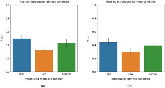 Effects of fairness on user trust under different explanations. (a) effects of fairness on user trust under the example-based explanation; (b) effects of fairness on user trust under feature importance-based explanations.