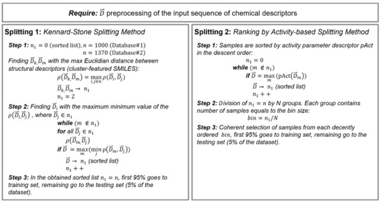 Pseudocode of the dataset partitioning splitting methods. (A) Train–test splitting using Kennard–Stone algorithm. (B) Ranking by activity train–test splitting algorithm. Due to the 5%/95% partitioning ratio with regard to the original dataset, we elaborated with the first n = 1000 (Dataset#1) and n = 1370 (Dataset#2) samples to have a feasible round number for the train–test splitting.