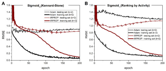 Graphical examples of RMSE evolution for the training and testing phases for the QSARs with D2-featured array length SMILES representations using Kennard–Stone and ranking by activity-based splits are shown in Figure 5. Here, testing progress reached 0.77 and 0.79 minimum values for Kennard–Stone-based partitioning with the iRPROP− and Adam optimizer-based learnings, respectively (Figure 5A). For the models with ranking by activity train–test splitting, the minimum RMSE for those with the VLA-SMILES D2 reached 0.95 and 1.18 when implementing iRPROP− and Adam learning algorithms, respectively (Figure 5B).