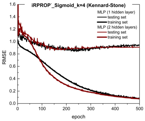 RMSE values for testing sets for MLP with two hidden layers using iRPROP− and Adam optimizer learning (Sigmoid activation function, Kennard–Stone-based train–test split), Dataset#1.