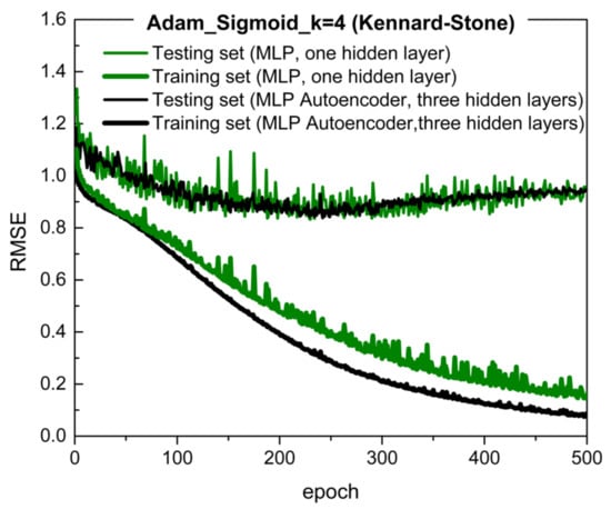 Figure 6 shows the evolution of RMSE as a function of epoch in the training and testing phases for one- and two-hidden-layer MLPs with iRPROP− and Adam optimizer and the D4 VLA-featured SMILES descriptors. When using the iRPROP− learning procedure, the testing set’s loss function reached a similar minimum RMSE of 0.88 and 0.84 for one- and two-layered MLPs, respectively.