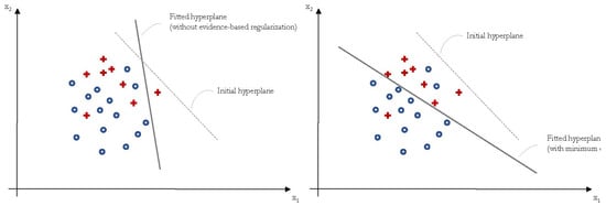 An example of a trained hyperplane potentially over-fitting the data (left) versus a hyperplane supported by more evidence (right).
