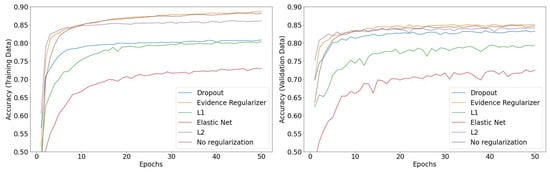 In Figure 2, we can observe the training and validation accuracy results of the evidence-based regularization outperforming the traditional regularization methods.