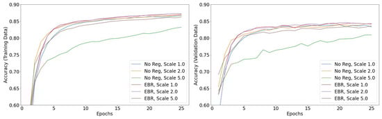 Figure 5 presents the resulting cross-entropy loss curves for the training data (left) and validation data (right) at different epochs of training while Figure 6 presents the corresponding accuracy curves. The results show that training of the network with the EBR progresses virtually unchanged for variances as high as five times the stable level. This shows that the EBR has the property of stabilizing training and makes training progress less dependent on the initial state of the network.