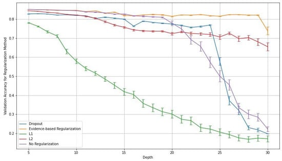 The improved activation highlighted above has a beneficial impact on our ability to train deep and narrow networks, where the vanishing/exploding gradient can hinder the ability of a network to converge onto an acceptable solution (see [29] for a thorough review of this phenomena). To illustrate this, we explore how the evidence-based regularization technique performs compared to other traditional regularization methods when using a narrow but relatively deep neural network: starting from 5 layers up to a depth of 30, with a width of 10. We perform 100 tests using different seeds for each depth (the 100 different seeds are kept constant across depths and are included in the Appendix B for reproducibility of results), reporting the average validation accuracy at the end of the training period.