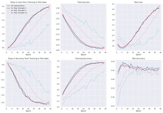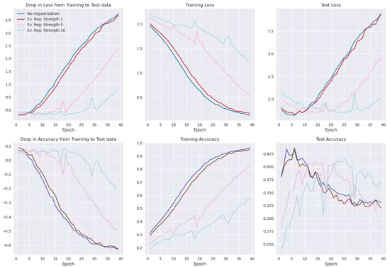 We compare the unregularized network to a network that uses the evidence regularizer in each hidden layer. The resulting training curves for the cross-entropy loss and the accuracy of the models are shown in Figure 8 for the clean labels and in Figure 9 for noisy labels. Each figure shows the training and test curves, as well as the drop in outcome between training and test data. This drop represents the effect of overfitting on the training data. A successful regularization will move this curve close to zero throughout training, i.e., minimal statistical difference between the data that the network was trained on (training data) and new, unseen data for which the model needs to predict labels (test data). We try three different regularization strengths (1.0, 5.0, and 10.0) to examine how stronger regularization affects results.