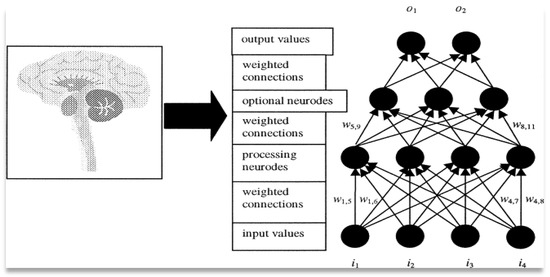 ANN is knowledge based on brain and nervous system analyses, as depicted in Figure 2. These networks contend with a biological neural network, but they employ a lesser set of theories than biological neural systems. Mainly, ANN models simulate the brain and nervous system’s electrical activity [43,44]. Processing elements (also known as either a neuron or perceptron) are linked to other processing elements. Usually, the neurons are arranged in a layer or vector, with the output of one layer acting as the input to the next layer and possibly other layers [45,46]. A neuron may be linked to all or a subset of the neurons in the subsequent layer, with these connections simulating the brain’s synaptic networks. Weighted data signals entering a neuron simulate the electrical excitation of a nerve cell and, subsequently, the transmission of information within the network or brain [47,48].