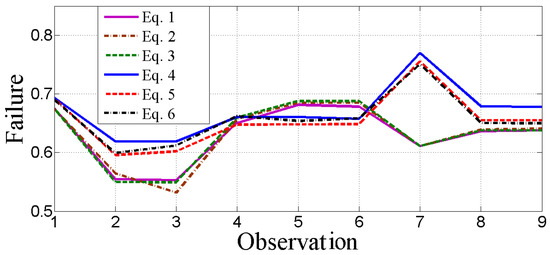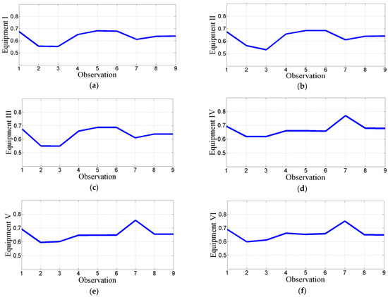 In the following, the conditions resulting from the general condition of the equipment will be checked. As can be seen in Figure 5, the overall condition index of the six types of equipment over time is examined. According to this analysis, the general equipment monitoring index trend is almost deteriorating. This procedure is unique for different equipment. In all the equipment, the index trend initially showed an improvement in the second sample and then went to failure. In equipment items 4, 5 and 6, the seventh data sample has the worst condition, while equipment items 1, 2 and 3 in these data have a much better situation. According to what has been said, when the values of these graphs are less than the value of e−1 = 0.367 the equipment conditions will be critical.