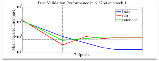For this case study, we selected the NARX model of the neural network and used the Levenberg–Marquardt train model. A multilayer perceptron neural network estimated the remaining useful life. After performing the simulation with MATLAB software, we examined the output details. Figure 7 can predict the failure time of CP. The blue line is the training results, the green line is the validation result, and the red line is the test data. Due to the lack of data in this diagram, the training data diagram (train data) fits poorly with the test data diagram. Validation of the network training accuracy is possible by matching proof and test charts. When the training data diagram is most different from the test data, and there are sudden changes in the test data diagram, it is time to pay more attention to the CP system and check the condition of the tube.